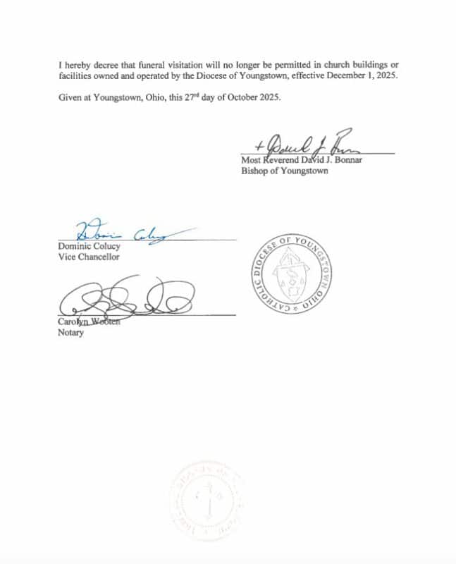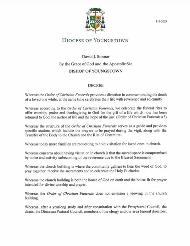Funeral visitation will no longer be allowed in church buildings or facilities in the Diocese of Youngstown, effective Dec. 1.