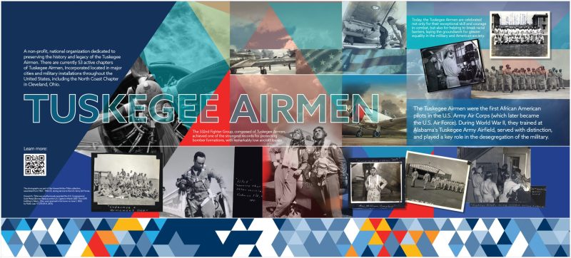 - Exit Wall Exhibit – This expansive mural weaves together African American cultural elements and patriotic themes to tell the Airmen’s story. The North Coast Chapter of the Tuskegee Airmen provided archival photos to ensure historical accuracy and authenticity.